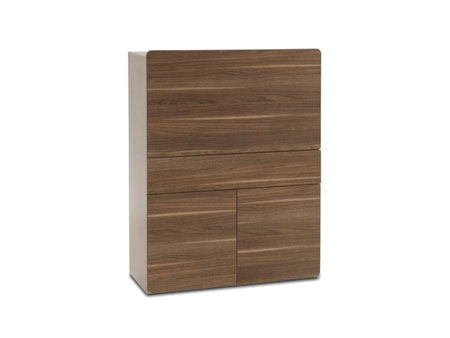 Состоит из шкафчика-бара, выдвижного ящика и двух шкафчиков с полками. Все ящики и шкафы не имеют ручек для открытия, оснащены системой push-up.