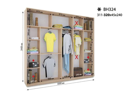 45.00см x 320.00см x 240.00см Характеристики шкафа Количество дверей 4 двери Материал корпуса ДСП 18мм, кромка ПВХ 0,5 и 2мм Оснащение 12 полок, четыре двери (ДСП или зеркало), 4 отделения для тремпелей, 4 микролифта Форма шкафа линейный Четырехдверный шкаф-купе ВН324 - это модель XXI века, которая прекрасно вместит в себя массу полезных вещей и украсит любое масштабное помещение. В комплектацию модели входит: 12 полок, 4 отделения для тремпелей с четырьмя микролифтами и четыре двери с профилем Элит в цвете серебро. Дополнительно можно заказать блок В35 или В50. Двери шкафа могут быть выполнены из ДСП, зеркальные, комбинированные или же с горизонтальными или вертикальными делениями. Размеры шкафа: глубина/ширина/высота - 45/311-320/240. Цена указана за шкаф стандартного размера шириной 320см. Шкаф с нестандартной шириной от 311см до 319см оплачивается дополнительно. Также возможно изготовление шкафа высотой 250см. Материалы, из которых изготовлен шкаф-купе ВН324: Корпус: ДСП 18мм;Фасады: зеркальные и панельные;Кромка: ПВХ 0.5 и 2мм;Зеркало: 4 мм;Штанга: микролифт металлический.Профиль: Элит или Квадратный. Цвет: серебро, золото светлое, бронза светлая, венге глянец.Раздвижная система: алюминиевая. Стандартные цвета в складской программе: венге магия;яблоня Локарно;ольха горная;дуб молочный;белый;орех лесной. Срок изготовления шкафов в стандартной цветовой гамме составляет 3-4 дня. Стандартные цвета, не входящие в складскую программу: орех темный. Срок изготовления шкафов в этих цветах составляет 10 дней. Нестандартные цвета: дуб арканзас темный. Шкафы в нестандартных цветах изготавливаются за дополнительную плату в течении 10 дней. Данные цвета не используются для фасадов.