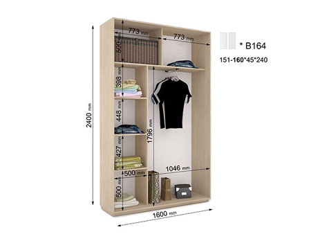 45.00см x 160.00см x 240.00см Характеристики шкафа Количество дверей2 двери Материал корпусаДСП 18мм, кромка ПВХ 0,5 и 2мм Оснащение6 полок, две двери (ДСП или зеркало), микролифт Форма шкафалинейный <strong style="font-size: 12px;">Двухдверный шкаф-купе В164 - это необыкновенно стильный и вместительный шкаф, который не только украсит Ваш интерьер, но и станет полезной вещью в Вашем доме, не занимая много места.В комплектацию модели входит: 6 полок, отделение для тремпелей с микролифтом и две двери с профилем Элит в цвете серебро. Дополнительно можно заказать блок В35. Двери шкафа могут быть выполнены из ДСП, зеркальные, комбинированные или же с вертикальными делениями. Размеры шкафа: глубина/ширина/высота - 45/151-160/240. Возможно выполнение шкафов высотой 250см за дополнительную плату. Материалы, из которых изготовлен шкаф-купе В164: Корпус: ДСП 18мм; Фасады: зеркальные и панельные; Кромка: ПВХ 0.5 и 2мм; Зеркало: 4 мм; Штанга: микролифт металлический. Профиль: Элит или Квадратный. Цвет: серебро, золото светлое, бронза светлая, венге глянец. Раздвижная система: алюминиевая. Стандартные цвета в складской программе: венге магия; яблоня Локарно; ольха горная; дуб молочный; белый; орех лесной. Срок изготовления шкафов в стандартной цветовой гамме составляет 3-4 дня. Стандартные цвета, не входящие в складскую программу: орех темный. Срок изготовления шкафов в этих цветах составляет 10 дней. Нестандартные цвета: дуб арканзас темный. Шкафы в нестандартных цветах изготавливаются за дополнительную плату в течении 10 дней. Данные цвета не используются для фасадов.