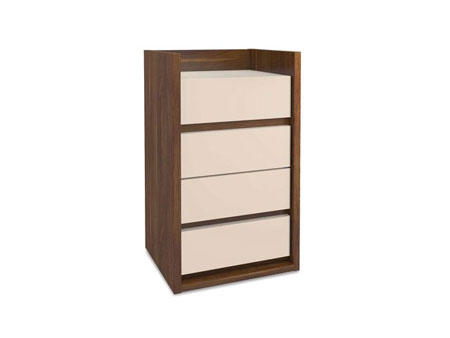 Комод состоит из четырех выдвижных ящиков. Направляющие в ящиках, делают закрытие легким и тихим. Ручек для открытия на ящиках нет, но открыть вы их сможете при помощи нажатия на него.