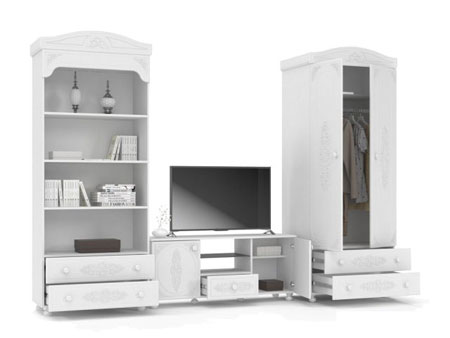 Характеристики мебели Материал ДСП, МДФ Комплект для гостиной Ассоль-3 белый. Включает в себя: Тумбу ТВ АС-13; Пенал АС-03; Шкаф АС-02. Размеры тумбы ТВ АС-13: ширина - 125 см; длина - 36 см; высота - 53 см. Размеры пенала АС-03: ширина - 83 см; глубина - 40 см; высота - 206 см. Размеры шкафа АС-02: ширина - 83 см; глубина - 50 см; высота - 206 см. Ручки – фигурные. Материал фасадов: фирменная текстура 3D. Материал корпуса: ДСП ламинированное 18 мм. Цвет: белый.