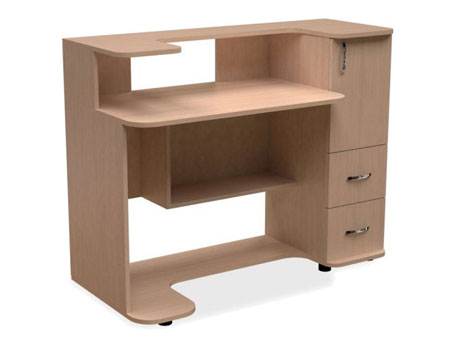 120.00см x 55.00см x 95.00см Характеристики мебели Материал ДСП Компьютерный стол НСК-34 – удобная модель с надставкой над столешницей, обеспечивающая дополнительную рабочую поверхность. Стол отлично подойдет для стойки-ресепшн в офисе. Модель укомплектована тумбой с закрытыми полками и двумя выдвижными ящиками. В нижней части стола имеется дополнительная открытая полка. Материалом для изготовления данной модели служит ламинированная ДСП. На выбор предоставляется широкая палитра цветов. По желанию заказчика возможно изготовление модели в нестандартном цвете за дополнительную плату. Материал: корпус - ДСП 16мм; кромка торцов столешницы - ПВХ 2мм; кромка остальных торцов - ПВХ 0,5 мм.