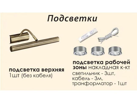 В стоимость кухни входит базовая комплектация и цена за столешницу, дополнительные опции оплачиваются отдельно.