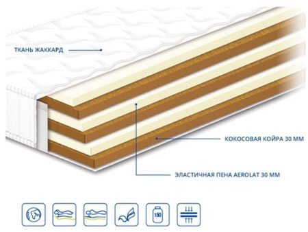 200.00см x 180.00см x 19.00см Матрасы Допустимая нагрузкадо 150 кг Пружинный блокнет Составэластичная пена Aerolat 3 см; кокосовая койра 3 см Эффект зима-летонет Матрас ортопедический Нeo Cocos 180х200Состав:- ткань жаккард- эластичная пена Aerolat 3 см- кокосовая койра 3 см- эластичная пена Aerolat 3 см- кокосовая койра 3 см- эластичная пена Aerolat 3 см- кокосовая койра 3 см- ткань жаккардЖесткость: жесткийВысота: до 19 смМаксимальная нагрузка: до 150 кг на одно спальное местоГарантия: 3 года