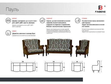 90.00см x 88.00см x 105.00см Вес0.00кг Характеристики кресла Материал обивкикожзам, ткань Характеристики мебели Материалнатуральное дерево, ДСП, ДВП.Страна производительУкраина Мягкое кресло Paul Сидение на основе ламелей, войлока, пружинного блока, высококачественного поролона - все для долгой и безупречной работы. Конструкция спинки дополнительно оснащена эластичными резиновыми пасами. Обивка любой тканью или кожзамом на выбор. Характеристики: Длина: 88 см Глубина: 90 см Высота посадочной части: 47 см Высота спинки: 105 см Каркас кресла: натуральное дерево, ДСП, ДВП. Опоры: дерево, металл. Подушка сидения и спинки: высококачественный пенополиуретан Vita, Польша.