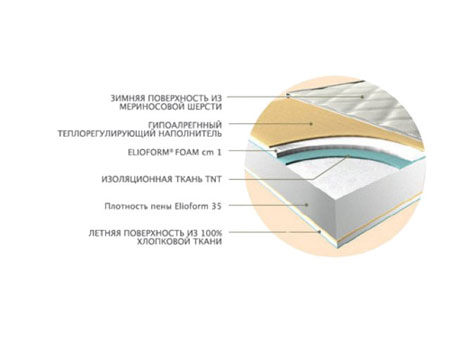 Чехол зимней стороны изготовлен из натуральной мериносовой шерсти. Это покрытие из мериносовой шерсти обладает большим количеством лечебных свойств: оно способствует уменьшению боли, особенно при ревматизме и радикулите; обеспечивает нормальный теплообмен тела, регулирует влажность, долговечна. Шерсть сохраняет температуру тела человека, что способствует комфортному сну в зимний период времени.