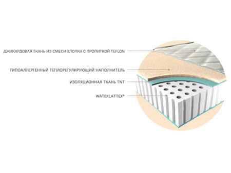 В основе наполнителя используется, новый материал - Waterlatex. Он состоит и латекса, который соединяют с вулканизированным полиуретаном. Он безопасен для окружающей среды. Материал имеет пористую структуру, которая отлично пропускает воздух, нетоксичен, гипоаллергенный и эргономичный материал. К тому же он очень эластичен, что способствует правильному распределению давления тела человека на поверхность матраса.