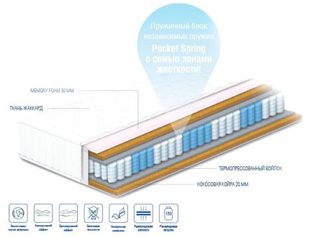 200.00см x 150.00см x 23.00см Матрасы Допустимая нагрузкадо 150 кг Пружинный блокPocket Spring Составпена Memory foam 3 см; кокосовая койра 2 см; термопрессованный войлок; пружинный блок Pocket Spring 7 зон жесткости Эффект зима-летонет Ортопедический матрас Персей Memory 150х200Состав:- ткань жаккард- пена Memory foam 3 см- кокосовая койра 2 см- термопрессованный войлок- пружинный блок Pocket Spring 7 зон жесткости- термопрессованный войлок - кокосовая койра 2 см- ткань жаккардЖесткость: жесткийВысота: до 23 смМаксимальная нагрузка: до 150 кг на одно спальное местоГарантия: 20 лет на пружинный блок и 3 года на ткани и наполнения
