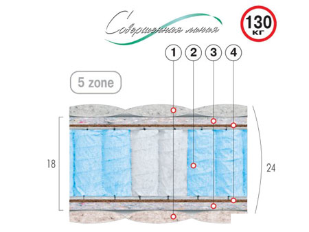 Thermoflex. Ортопедический матрас Рубин 180х200 оказывает полноценную поддержку всех отделов позвоночника, благодаря свойствам независимого пружинного блока Pocket Spring.5-тизональное размещение пружин разной степени жесткости позволяет дифференцировать уровень поддержки для разных отделов позвоночника.Изолирующей прослойкой выступает кокосовая койра, которая придает жесткость.Настил Thermoflex – нетканый материал, обладающий теплосберегающими свойствами и высокой воздухопроницаемостью.Эффект "зима-лето" обеспечивает объемный наполнитель чехла с волокнами хлопка и шерсти. Состав: чехол - стеганный трикотаж (бортовая лента из жаккарда) с объемным наполнителем волокнами хлопка и шерсти (1); настил Thermoflex (3); кокосовая койра (4); пружинный блок Pocket Spring с пружинами разной упругости (2). Технические характеристики:Высота: 24 см.Нагрузка: 120 кг.Уровень жесткости: выше среднего.
