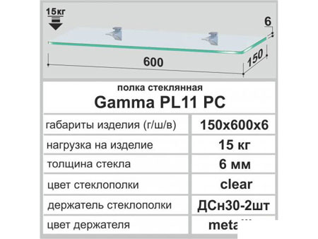 Полка стеклянная Gamma PL 11 PC 150х600х6