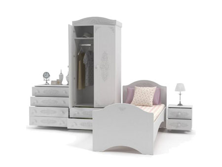 Характеристики мебели Материал ДСП, МДФ Спальный гарнитур Ассоль-2. В комплект входит: Кровать АС-09 (спальное место 80х200 см); Шкаф АС-02; Комод АС-05; Тумба прикроватная АС-04. Размеры кровати АС-09: ширина - 85 см; длина - 204 см; высота - 290 см. Размеры шкафа АС-02: ширина - 83 см; глубина - 50 см; высота - 206 см. Размеры комода АС-05: ширина - 80 см; глубина - 50 см; высота - 80 см. Размеры тумбы прикроватной АС-04: ширина - 45 см; глубина - 35 см; высота - 45 см. Ручки – фигурные. Материал фасадов: фирменная текстура 3D. Материал корпуса: ДСП ламинированное 18 мм. Цвет: белый.
