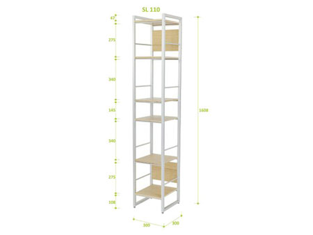 30.00см x 30.00см x 160.80см Характеристики мебели Материалалюминий, ДСП Стеллаж SL110Характеристики:Каркас: алюминийПолки: ДСПРегулируемые опоры.Вес: 8.6 кгДопустимая нагрузка: 60 кгРазмер:Ширина: 30 смГлубина: 30 смВысота: 160.8 см