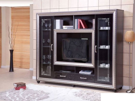 Имеет отделение для размещения телевизора, а также множество полок за красивыми узорчастыми стеклами распашных дверей. Полки есть и открытые, которые находятся как под телевизором, так и над телевизором.