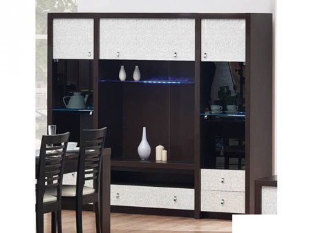 Имеет отделение для размещения телевизора, а также множество полок за стеклянными и непросвечиваемыми распашными дверцами.