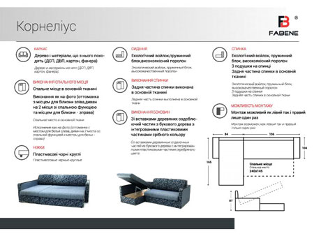 165.00см x 240.00см x 87.00см Вес0.00кг Характеристики дивана (кресла, тахты, углового дивана) Механизм трансформацииеврокнижкаОснова сидениявысококачественный пенополиуретан Vita , Польша.Размер спального места145х240ВидраскладнойБельевой ящикесть Угловой диван Корнелиус Раскладной угловой диван в классическом исполнении с двумя вместительными ящиками для белья. Сидение на основе ламелей, войлока, пружинного блока, высококачественного поролона - все для долгой и безупречной работы. Конструкция спинки дополнительно оснащена эластичными резиновыми пасами. Обивка любой тканью на выбор. Возможен левый или правый монтаж при сборке. Характеристики: Длина дивана: 240 см Глубина дивана: 165 см Высота дивана с учетом спинки: 87 см Длина спального места: 240 см Ширина спального места: 145 см Каркас: натуральное дерево, ДСП, ДВП. Основание спального места: ДСП, пружинный блок. Опоры: пластмасса. Подушка сидения и спинки: высококачественный пенополиуретан Vita, Польша.